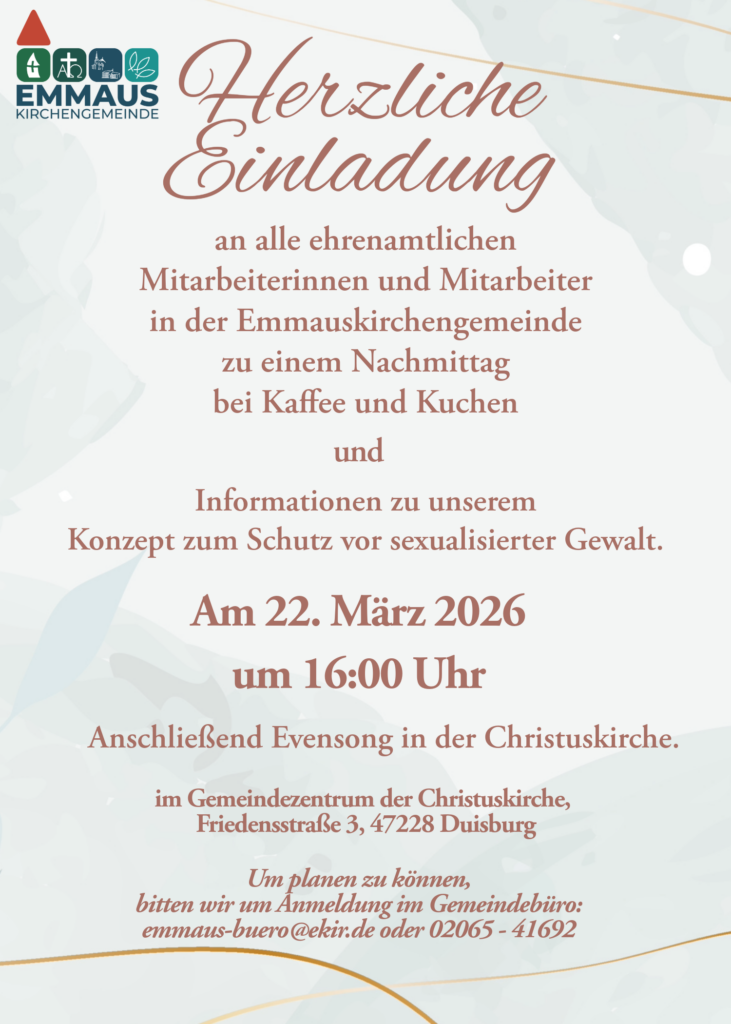 Vielleicht ist der Karneval mitten im Februar genau deshalb so passend: Er unterbricht, relativiert, nimmt dem Ernst des Lebens nicht die Würde, aber seine Schwere. Ich wünsche uns, dass wir als Emmaus-Gemeinde durch diese Zeit mit offenen Augen und Humor gehen – im Vertrauen darauf, dass Gott auch auf unseren ungeplanten Wegen mitgeht. Gerade dort, wo manches schief und nicht alles nach Plan läuft.